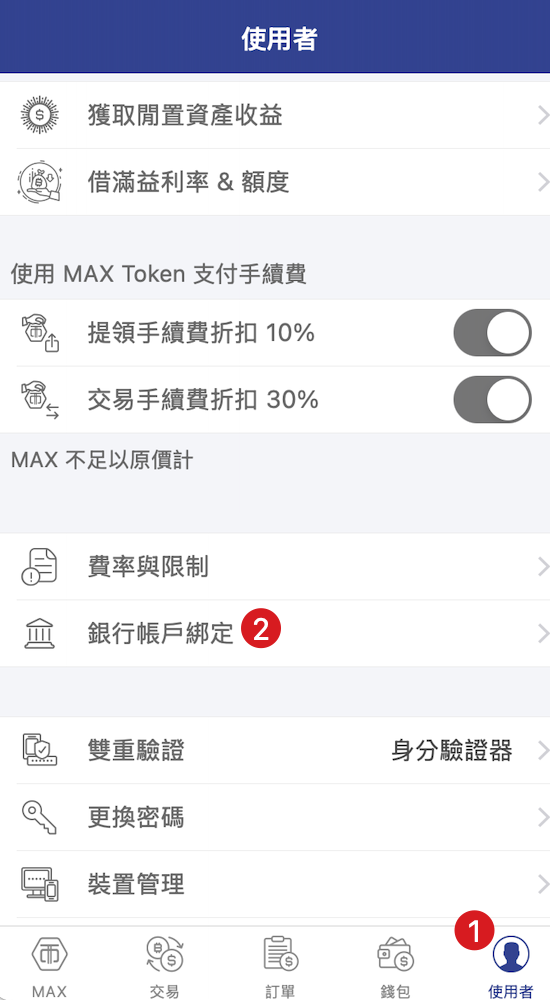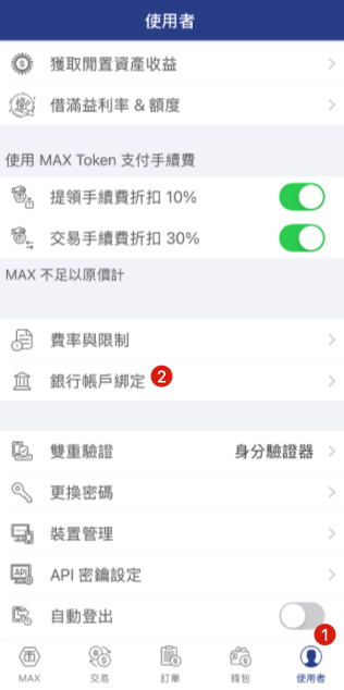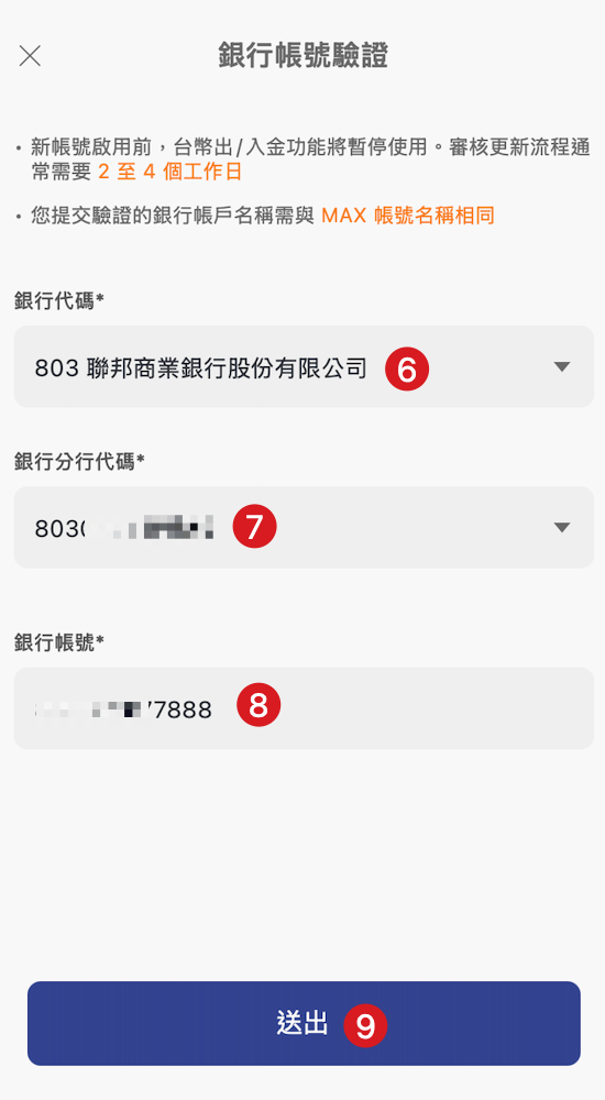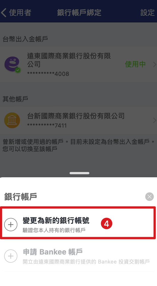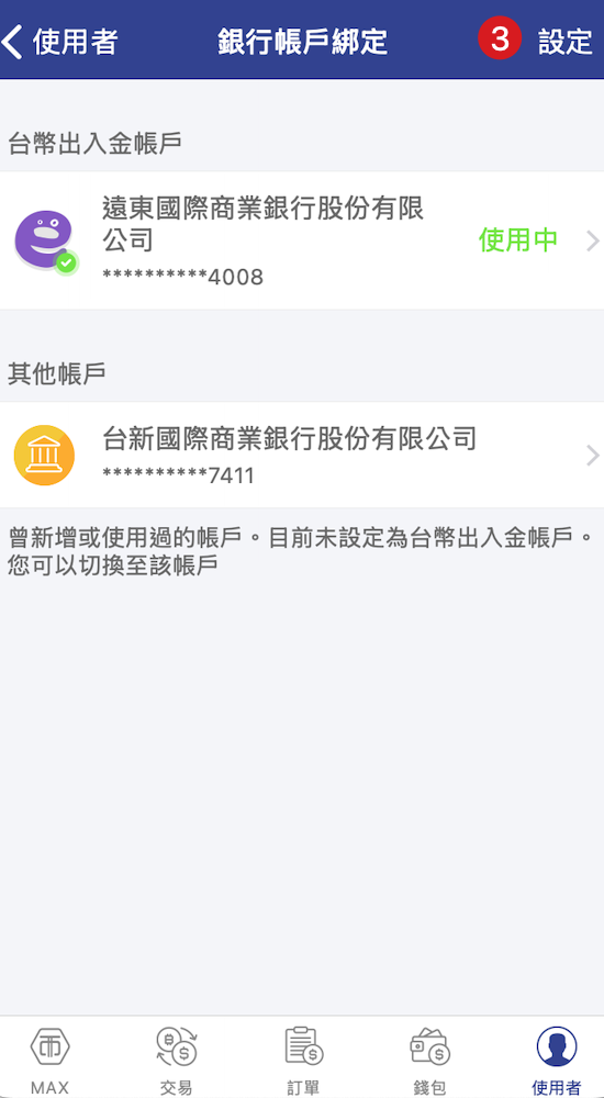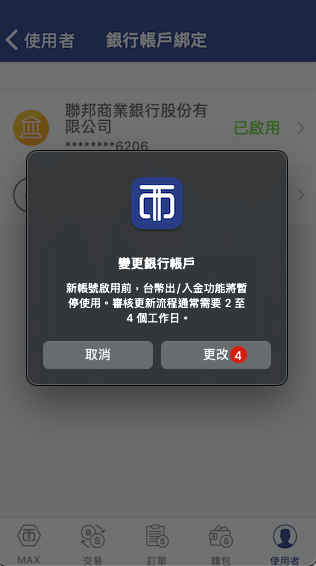 - 修改銀行需重新審核,需要 2~4 個工作天(不含六日及國定假日),驗證完成後的 2 個工作天才會啟用出/入金功能,期間將無法使用台幣相關功能。