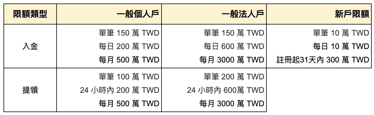 | 入金 | 單筆 150 萬 TWD 每日 200 萬 TWD 每月 500 萬 TWD | 單筆 150 萬 TWD 每日 600 萬 TWD 每月 3000 萬 TWD | 單筆 10 萬 TWD 每日 10 萬 TWD 註冊起 31 天內 300 萬 TWD |